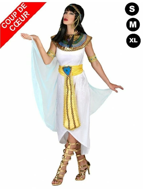 Votre soirée ou simplement votre fête est placée sur le thème de l’Egypte ? nous vous proposons cette tenue de couleur blanche entièrement en velours. Ce déguisement comprend donc la longue robe arrondie sur la partie basse de l’arrière, sur laquelle vous nouerez la ceinture à motifs égyptiens. vous placerez le large col assorti à la ceinture autour de votre cou ainsi le tour de tête. Le léger voile bleu ciel est maintenu à l’arrière de la robe grâce à un velcro ; vous pourrez donc si vous le voulez le retirer. Pour plus d’aisance, de petits anneaux sont présents à chaque extrémités afin de le porter sans le tenir. Bonne soirée !